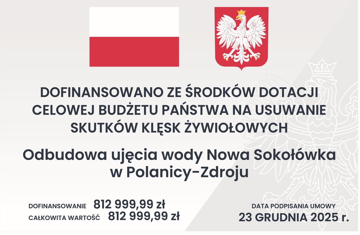 Dofinansowano z Rezerwy Celowej Budżetu Państwa na usuwanie skutków klęsk żywiołowych Kwota dotacji wynosi 100% wartości inwestycji = 812 999,99 zł Umowa o dofinansowanie z dnia 23 grudnia 2025 r.